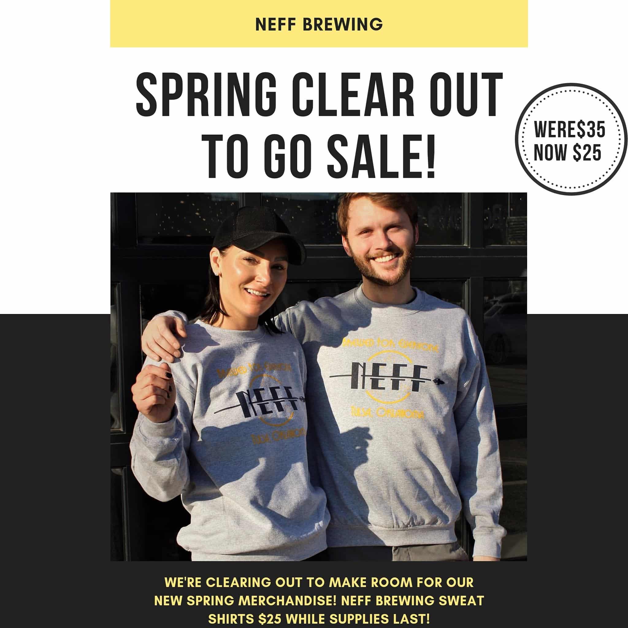 SPRING SALE! We're clearing out our cold weather merchandise to make room for our new spring merchandise. You can show your local support and get a NEFF Brewing sweatshirt to get you through the winter-spring transition!